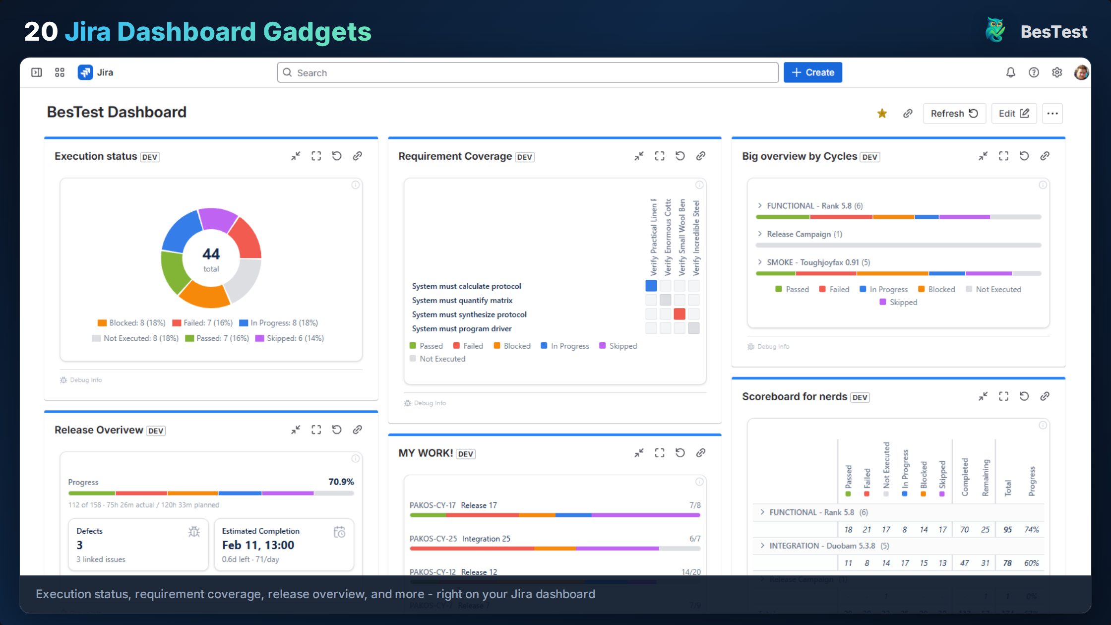 Native Jira offers basic tracking through issue statuses and JQL filters, but cannot calculate coverage metrics. For proper requirements tracking, use a dedicated plugin that provides: coverage status per requirement (covered, partially covered, uncovered), significance-based coverage calculation, traceability from requirements to test cases and defects, and dashboard gadgets showing real-time coverage status.