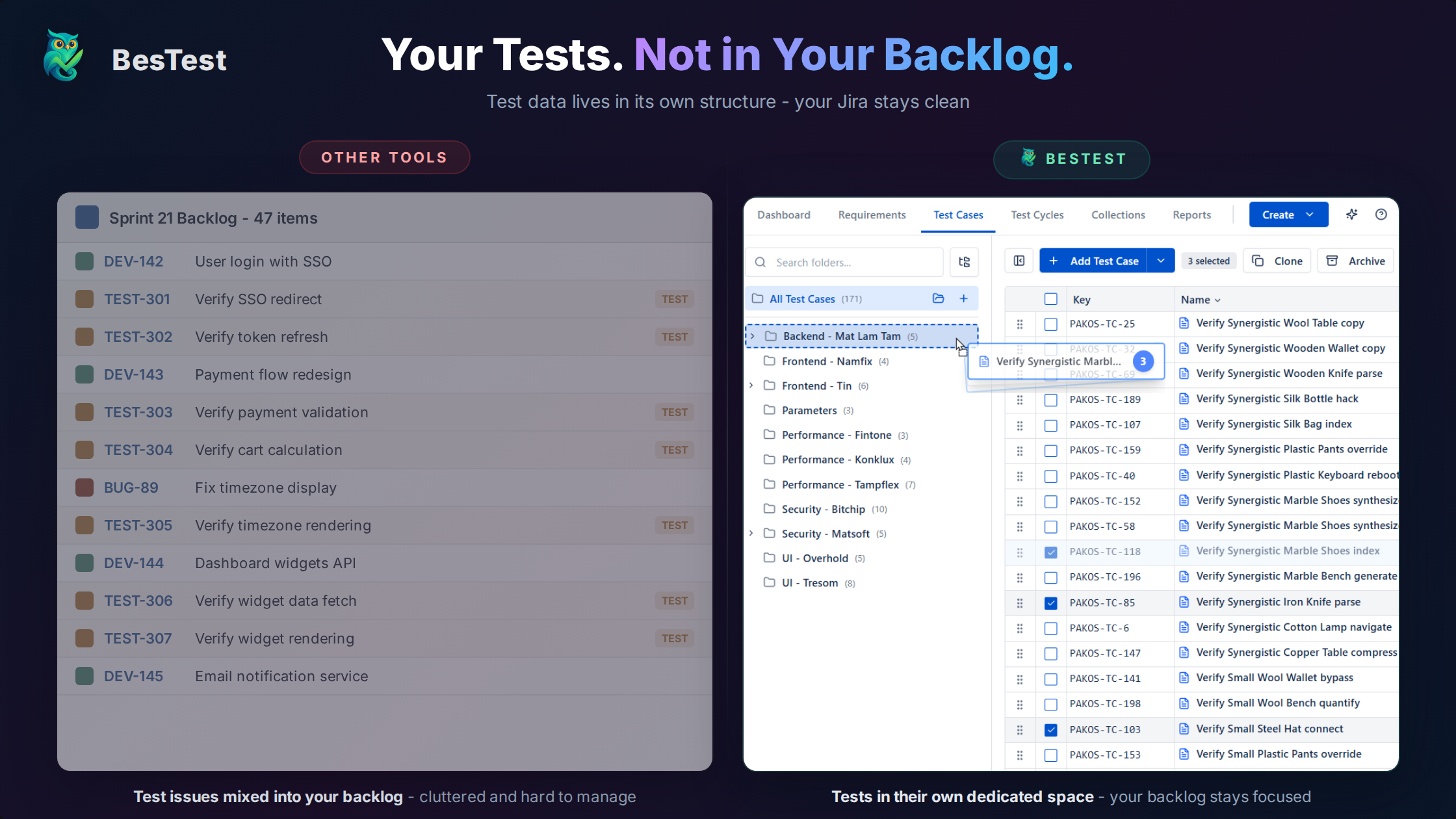 BesTest is built on Atlassian Forge, but stores test data in its own secure database - completely separate from Jira's issue tables. You get a Jira-native experience without the issue bloat. No extra issue types, no cluttered JQL results, and your Jira stays fast no matter how many tests you have.